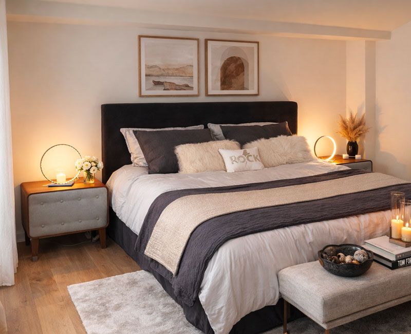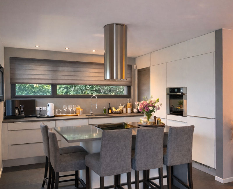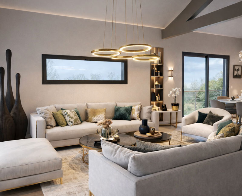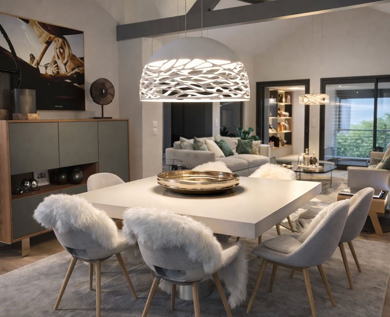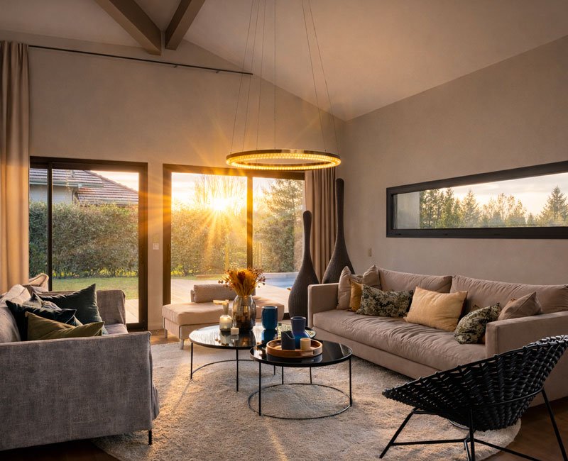 Pour cette maison neuve conçue sur plan d’architecte en France voisine, j’ai imaginé l’ensemble des espaces intérieurs afin de créer un cocon chaleureux, en harmonie avec son environnement entre vue sur le lac et cadre champêtre. Volumes, lumière et matières ont été pensés pour offrir un intérieur contemporain, apaisant et profondément accueillant.